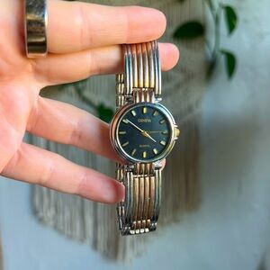 geneva quartz watch, black dial watch, two tone stretch watch, women’s expansion band watch, gold silver watch, vintage inspired wristwatch, untested quartz watch, stainless steel back, 80s 90s fashion watch, large wrist watch, fashion timepiece, rose gold silver watch