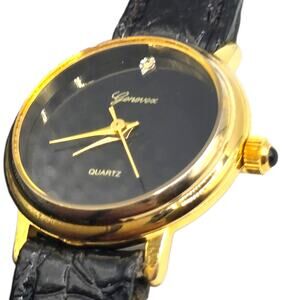Geneva Quartz Watch Women Black Dial Gold Tone 21mm Genuine Leather Band