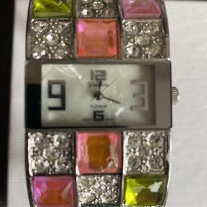 Vintage Geneva colorful rhinestone silvertone hinged cuff Watch. Works see video. Has new battery included. Great for some bling on New Year’s Eve! Smoke, pet and fragrance free home.