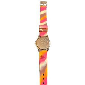 Water-resistant Geneva watch featuring a rhinestone bezel and a multicolor silicone strap. Ideal for adding a splash of color to your outfit.
