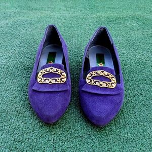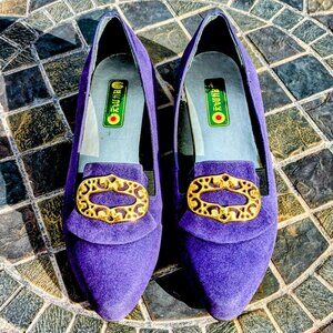 Classic retro purple velvet flats by Genga Vintage Japanese design with front gold metal circle buckle.