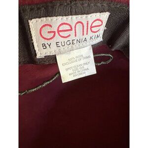 This stylish wool floppy hat by Genie is designed by Eugenia Kim. The maroon hat features a contrasting blue ribbon, adding a touch of sophistication.