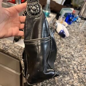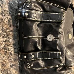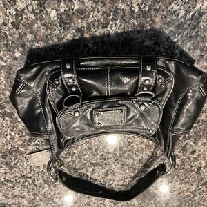 Black leather women's shoulder bag featuring a crocodile pattern on the straps and detailing.