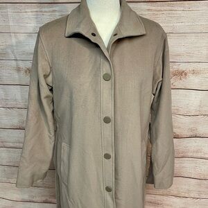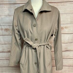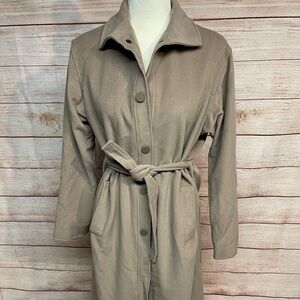 Gorgeous Genny Moda 100% wool long trench coat with snap buttons and belt. Made in Italy, fully lined, in excellent pre-owned condition with no known flaws.
