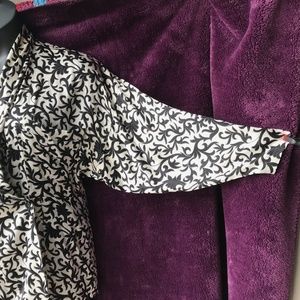 Vintage Versace design luxury silk satin blouse features unusual breadth in shoulders and upper arms, more fitted in wrapped/overlapping lower torso. Tunic style. Marked international sizes, with US size stated as 8. But fits larger per measurements: pit to pit flat 23”, waist at button overlap flat 17”, length 30”, dropped sleeve seam, but estimate sleeve length from natural shoulder 23”.