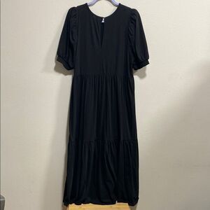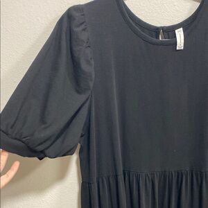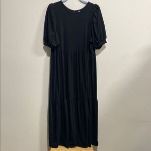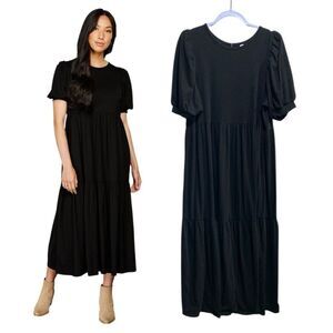 gentle fawn dress, black midi dress, puff sleeve tiered dress, cotton modal knit dress, minimalist chic, cottagecore outfit, comfy everyday dress, women’s size medium, modern streetwear, versatile layering dress