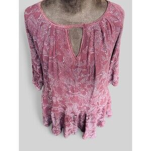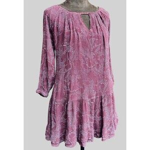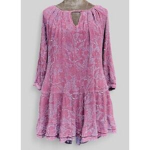 This boho bohemian style dress/tunic is by Gentle Fawn. Loose swing style with large ruffle at hem. Lined. 100% rayon. Dusty pink/mauve in color. Style this beautiful dress with a chunky belt and ankle boots.