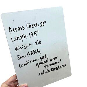 General wear throughout and a darkened area noted. Across chest = 20 inches, Length = 19.5 inches.
