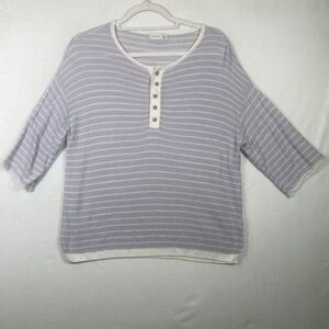 Measurements: Chest 19” | Length 25” | Sleeve 11”Color: Soft lilac with white horizontal stripesMaterial: 58% Linen, 42% RayonMade in ChinaDetails:Lightweight linen-blend knit, perfect for spring and summerHenley neckline with 5 functional buttonsElbow-length sleeves with raw edge detailRibbed trim at neckline and hemSubtle side vents for an easy, flattering fitSoft, breathable fabric ideal for layering or standalone wearCondition: Excellent pre-owned condition — no flaws or snags.Care: Hand wash cold, lay flat to dry.