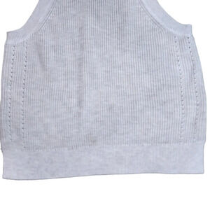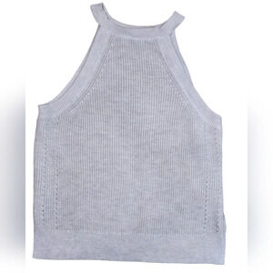 The Bay tank is made of a soft yarn in a half cardigan stitch pattern. Features include a halter neckline, pointelle stitch detailing, and side slits.