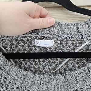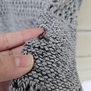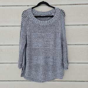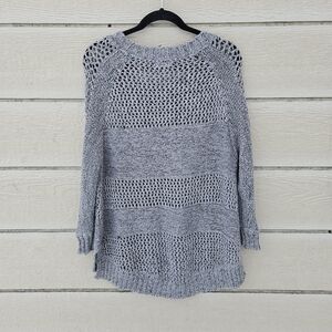 Relaxed fit sweater in a gray color with some black threads mixed in. Alternates segments of open knit and a tighter knit. Has two small snags (see last two photos) but in otherwise good shape. See photos for fabric and care details.