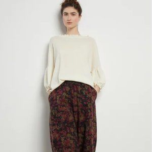 Brand new, tried on but never worn out of the house. Fine merino wool top trimmed with raw edge frills at neck and sleeves. Cut is wide and relaxed with dropped shoulders and puffed sleeves.Cuffs are elasticated for adjusting the look.