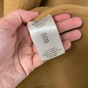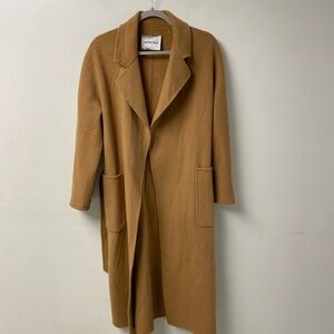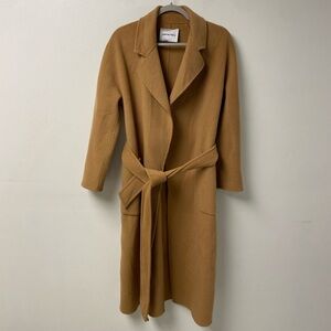 100% wool long line coat. Rectangle pockets and long belt. Rich tan color. Tag needs to be stitched on the bottom corners and two small flaws (pictured). Otherwise, really good condition and really high quality statement piece. Size Medium.