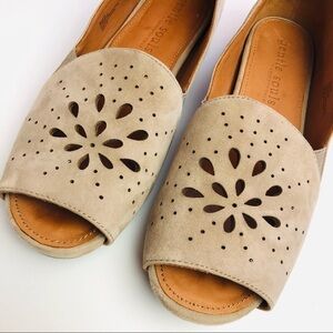gentle souls by Kenneth Cole Bayville taupe suede loafers in excellent condition. Taupe suede upper, decorative perforated vamp, peep toe, pull on with side goring, cushioned leather insoles, rubber soles.