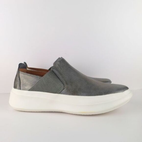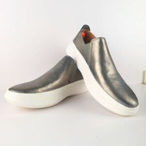 Stylish slip-on sneakers in pewter metallic leather. Features Gentle Souls by Kenneth Cole brand for superior comfort and durability. Ideal for casual wear.