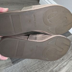 All leather uppers and lined. Stretchy elastic ankle band. 2.5" wedge heel. In great condition other than some light discolorations on heels, see photos. Cushy insoles. True to size. Color is between a light brown/tan and a taupe