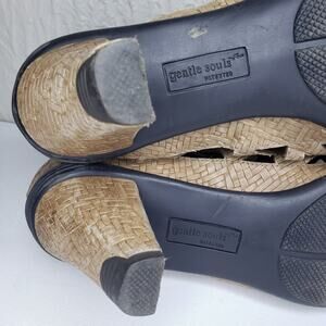 These brown leather gladiator heels sandals by Gentle Souls are a stylish choice for women in size 8. The lace-up closure and cone heel add a trendy touch, while the cushioned and breathable features provide comfort. Perfect for casual occasions in the summer, fall, or spring, the sandals feature an animal print pattern and bohemian theme. Made with leather upper and lining, they also have an adjustable strap for a customized fit. Good Pre-Owned Condition. Some creasing and scuffs from normal wear. Please View all Pictures for more details.