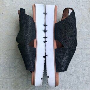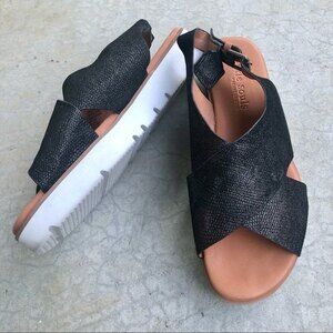 Gentle Souls Sandals Comfort Flatform Platform Black Leather Shimmer Open Toe. Thick wide criss cross straps. Padded cushioned foot bed. Slingback with adjustable buckle strap. Flats flat shoes with 1.5" white platform heels. Rubber Soles.