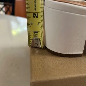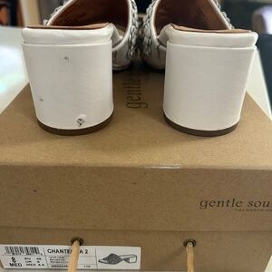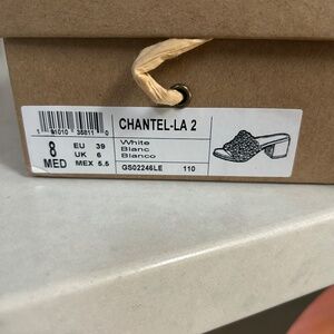 White leather slides with approx. 2.5" heel. Front part of shoe is covered with small flowers, each of which has a faux pearl in the middle. Excellent condition, and no pearls missing--only worn twice, to two weddings; one heel has a scrape and two small black marks (see photo; I think all could be covered with white polish or maybe even white-out). The leather is very soft--they're super comfortable shoes. Perfect for a wedding or other occasion. In box.