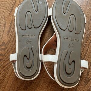 Chic and comfortable silver sandals by Gentle Souls. Good used condition. These were worn twice for special occasions. The leather is subtly sparkly and VERY SOFT. Side velcro closure for perfect fit.