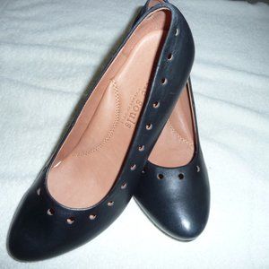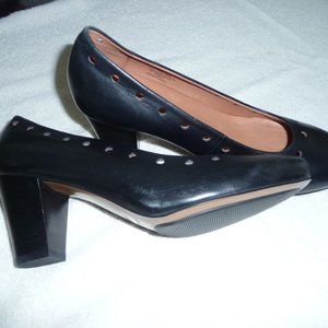Black leather upper with cut out detailing. Man made soles. Size 8.5 with approximately 2 inch heels. Purchased in the 2010's, but unworn in original box Believe made in the USA as they have a patent pending note on the inner shoe.