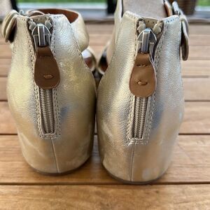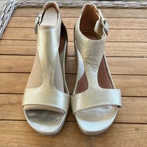Round-toe T-strap platform wedge sandals with zipper closure.