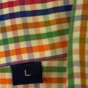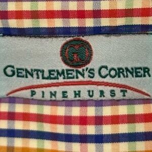 Pre-owned good condition rainbow striped dress shirt from Gentleman’s Corner Pinehurst. Size large. Approximately 23.5 inches pit to pit.