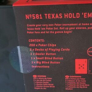 The Gentlemen's Hardware Texas Hold 'Em Poker Set Gift Tin #581 includes 200 poker chips and 2 card decks, 1 dealer button, 1 small blind button, and 1 big blind button.