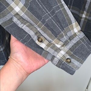 Gently Loved Stylish gray plaid button-up shirt by Carhartt. Features a classic design with a chest pocket. Washed and Ready to Wear!