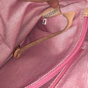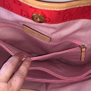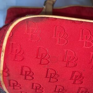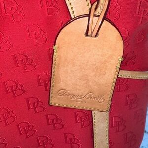 Beautiful Bright Red W Leather Trim and Luggage Tag Tote by Dooney & Bourke .. Inside is in Excellent Condition.. Outside Needs some TLC But Nothing Major .. Made of Quality Canvas and Leather that Dooney is Known For!