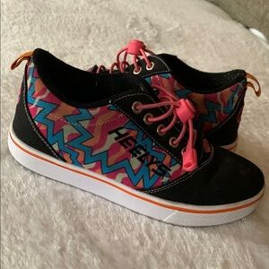 These Heelys kids shoes feature a vibrant zigzag pattern in black and pink. Perfect for active kids who love to skate and play.