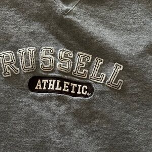 Gently Loved Cozy gray Crop sweatshirt with Russell Athletic logo. Perfect for casual wear. Washed and Ready to Wear!