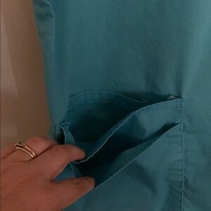 Comfortable turquoise scrub top with short sleeves and front pockets.
