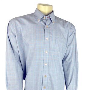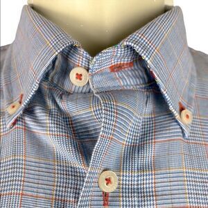 This Alan Flusser casual dress shirt is in excellent condition. 100% cotton, it is white, light blue and orange houndstooth plaid with complimentary blue and orange paisley cuffs and neck (inside trim), with white mother-of-pearl buttons. The XXL measures: