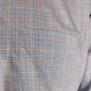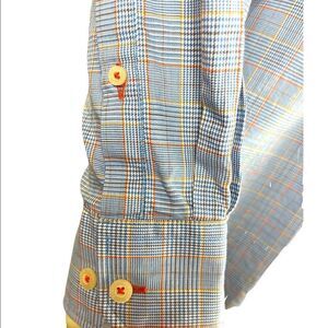 This Alan Flusser casual dress shirt is in excellent condition. 100% cotton, it is white, light blue and orange houndstooth plaid with complimentary blue and orange paisley cuffs and neck (inside trim), with white mother-of-pearl buttons. The XXL measures: