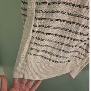 This sweater features a classic nautical-inspired stripe pattern that perfectly blends cottagecore aesthetics with everyday utility. Despite light wear and two tasteful repairs on the back (shown in photos), this piece has plenty of life left to offer. Its cozy knit and versatile design make it ideal for layering on cool mornings or relaxed weekends by the sea.