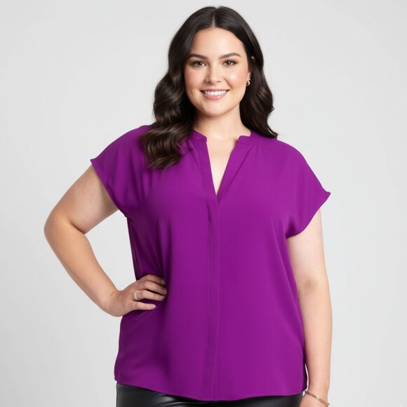 This ELOQUII eggplant purple blouse is the kind of effortlessly elevated essential every closet needs. With a flattering notch collar, long sleeves, and a relaxed fit, it’s made to move from desk to dinner without missing a beat.