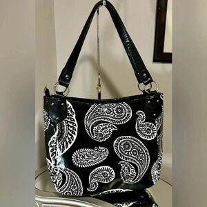 Gently Used GIGI HILL Coated Canvas Black and White Paisley Bag. This bag is in excellent with little to no signs of wear.
