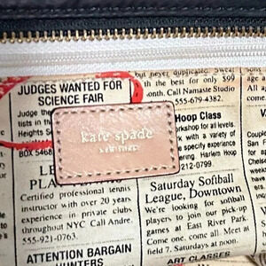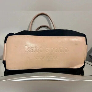 Gently Used KATE SPADE Black Nylon Shoulder Bag W/Tan Leather Handles. This bag is in excellent condition with some staining on the interior and some of the rubber edging is missing on the handles (please see last 2 pictures). Otherwise there is little to no other signs of wear.
