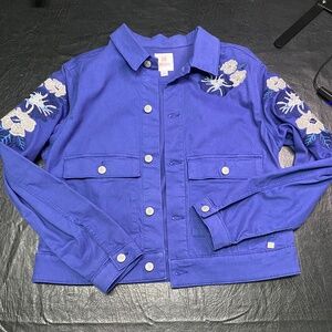 LulaRoe Harvey Embroidered Denim Jacket - Large. Fits sizes: 14-16. Gently Used. Smoke Free home. This is a versatile style and is beautiful. The flowers are not appliqués they are actually sewn (embroidered) on the jacket. Thisjacket has some spandex so it has some stretch. It has hidden inside pockets on both sides. Metal buttons, and very nicely made. Color: Blue With some silver/gray flowers.