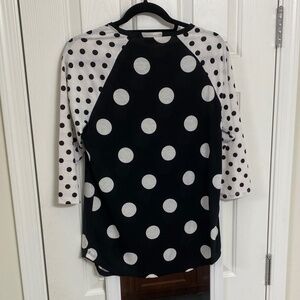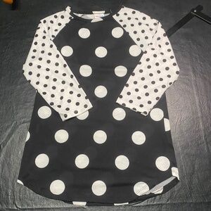 Gently Used - LulaRoe Randy Unisex Top. Medium. Fits sizes: 10-12. Smoke Free Home. This unisex shirt resembles a baseball T with its raglan, mid-length sleeves in contrasting, patterned fabric. Color: Black and White. Does not have a lot of stretch.