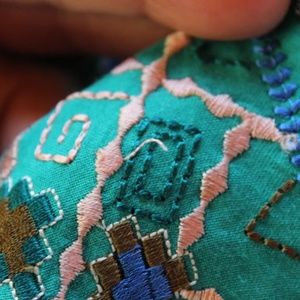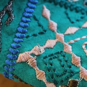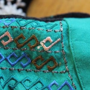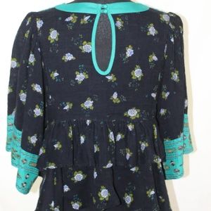 Gently used/loved, vibrantFree People "Kissed By the Sun" crop high-low top with removable (velcro) bottom ruffle making a higher crop, Size XS but extra roomy. Very generous cut, please see measurements. The colors and detail of this unusual top make it absolutely stunning and a fun pull-on, tassel lace-up top with key hole back and pretty 2 covered button closure. Turquoise bodice and bell sleeve cuff with applique and embroidery on black floral-printed heavy gauze blouse. Very minor pulls in the embroidery in spots, please see photos. Free People is one of my favorite clothing companies as they artistically consider the detail of their garments.