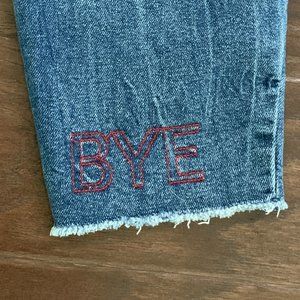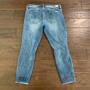 Gently Worn, but Lovingly Cared For, Seven 7 Limited Edition Mid Rise Stretch Novelty Ashbury Ankle Skinny Jeans. Women's Size 12. Waist: 17," Hips: 21," Length: 35.5," and Inseam: 25." (All measurements are taken with the garment laying flat.) 64% Cotton/35% Polyester/1% Spandex. Machine Wash/Line Dry. These jeans are accented with embroidery ("Now or Never" on the left front pocket, "Live Laugh, Love All above the right knee, and "Good" "Bye" on the back ankles) and feature whiskering and distressed details, zipper front with button closer, five-pocket styling, back yoke, and raw hem. No rips, pulls or stains, from a smoke-free home. Message with any questions.