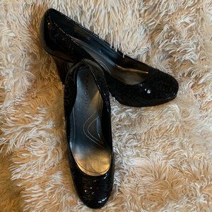 Gently Worn Tahari Cheryl Classy Black Sequined and Faux Patent Leather Heels. Women's Size 7 M. Heel 3.5 “ with a small platform. These heels feature a slightly padded sliver footbed and a rounded toe. Because they are very comfortable, they have been worn quite a few times but lovingly cared for. There are a few small indentations on the heel but are not noticeable unless you look at them close-up. They are the perfect shoe to go from the office to a night out. Message with questions.