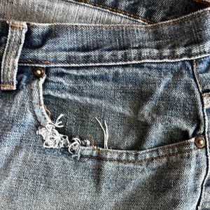 No rips or pulls from a smoke-free home. There is a small stain on the back of the jeans near the leather patch, but it is hard to see due to the type of wash. Message with any questions.