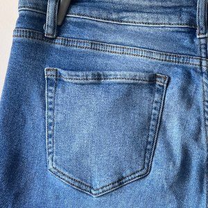 These high-rise mom jeans in a medium blue wash feature whiskering and distressed details, a zipper front with button closer, five-pocket styling, and a slightly arched back yoke. The denim material has a lot of stretch and is the perfect jean when you want to have that comfy lived-in feel—pairs perfectly with a cropped tee and Docs.