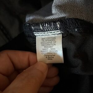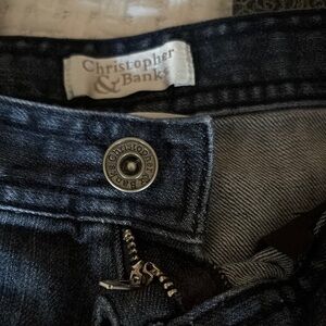 Beautiful Gently Loved Stylish women's capri jeans featuring a unique embroidered hem by Christopher & Banks Perfect for casual outings. Available in a classic blue color.
