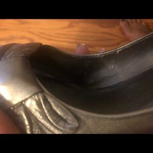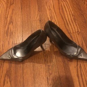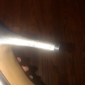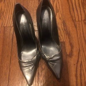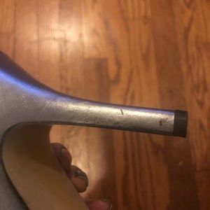 Gently worn silver Nine West Heels with a side bow. Slight black marks on the heels, and very slight creasing on the inside of the shoe. Otherwise the heels still have life in them. They just sit in my closet since I’m working from home.