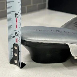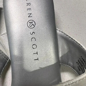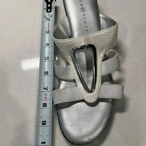 Karen Scott white leather and elastic sandals, gently worn, size 10. These comfortable sandals feature a 1-inch heel and cushioned insole for all-day wear.