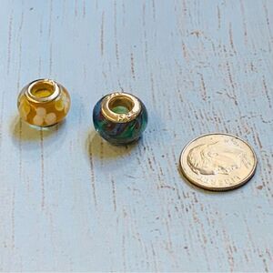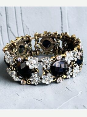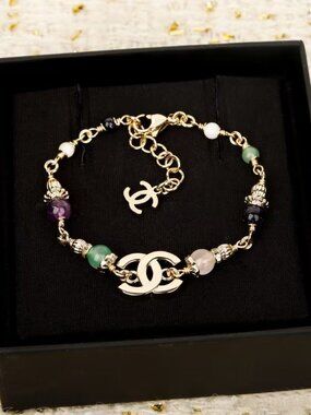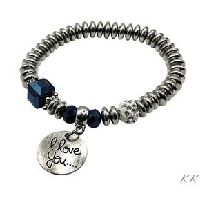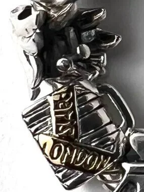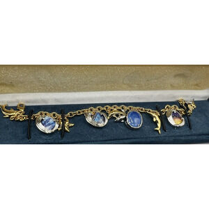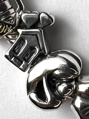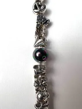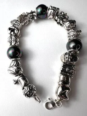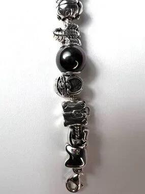 This is a Pre-loved SS charm bracelet in excellent condition. It has 15 charms and 3 black pearls, the charms are more than charming, gorgeous on both sides. Each individual charm is stamped 925, and the black pearls have an iridescent luster. There is a Hippopotamus, a suitcase, a shoe, a scorpion, a ladybug, afleur -de-lis , an elephant, a lily flower, a different suitcase, a house, a mother and child, a 4 leaf clover, a heart, a swan, a round etched bead and 3 pearls. Each charm has beautiful intricate details, like one of the suitcases have14kt gold details that read Paris-London, they all are meant to look good from every angle.